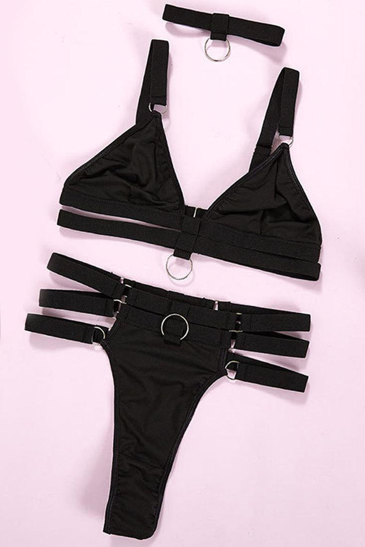 Black Bandage Strappy Choker Bra Thong 3Pc Lingerie Set