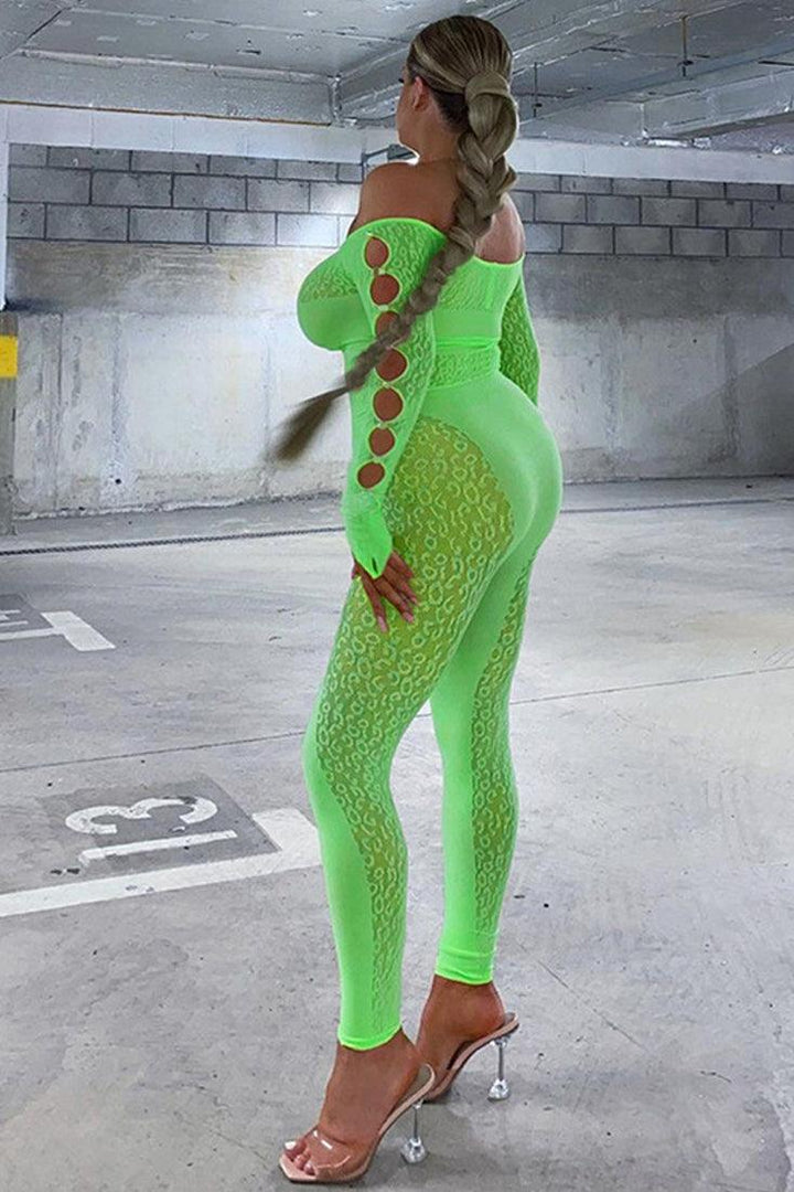Sexy Neon Green Stretchy Mesh Rhinestone Button Bodysuit Jumpsuit