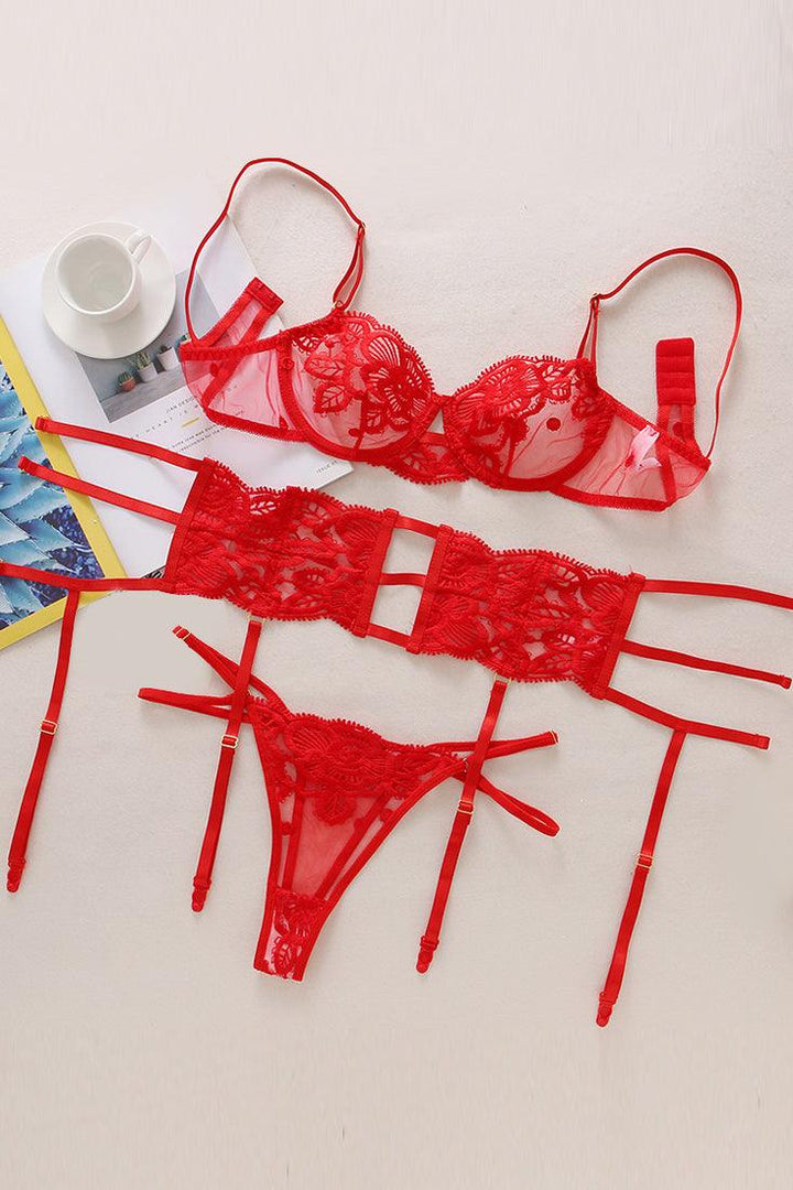 Red Floral Lace Mesh Sheer Strappy Bra Thong Garter Belt 3Pc Lingerie Set