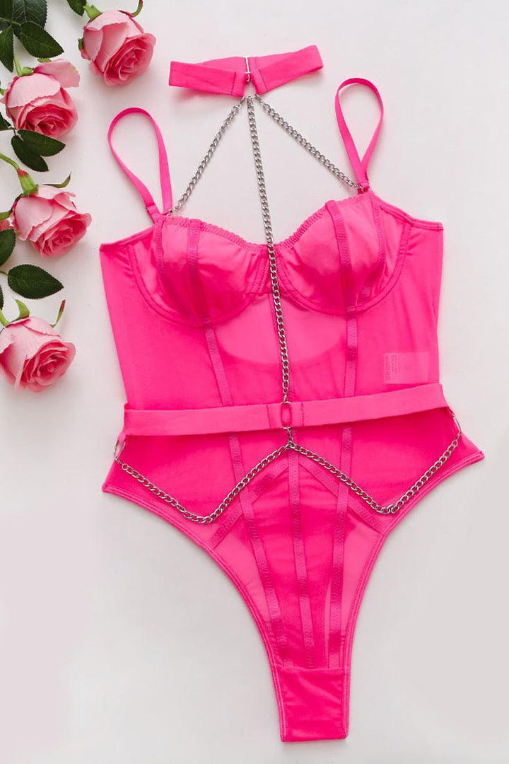 Unleash your inner vixen with this pink wired push-up mesh bodysuit, choker, belt. Complete with a sexy chain and bandage detailing, this 3-piece lingerie set is perfect for adding some sizzle to your bedroom attire. Dare to be bold and feel confident and seductive in this must-have teddy with thong back.