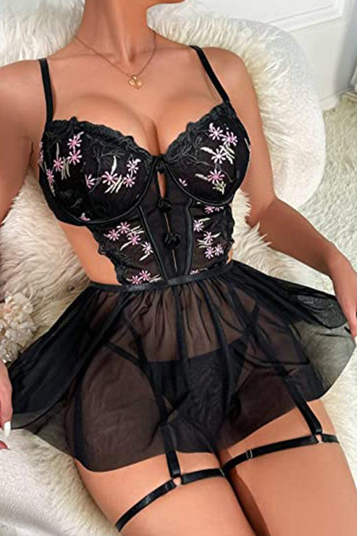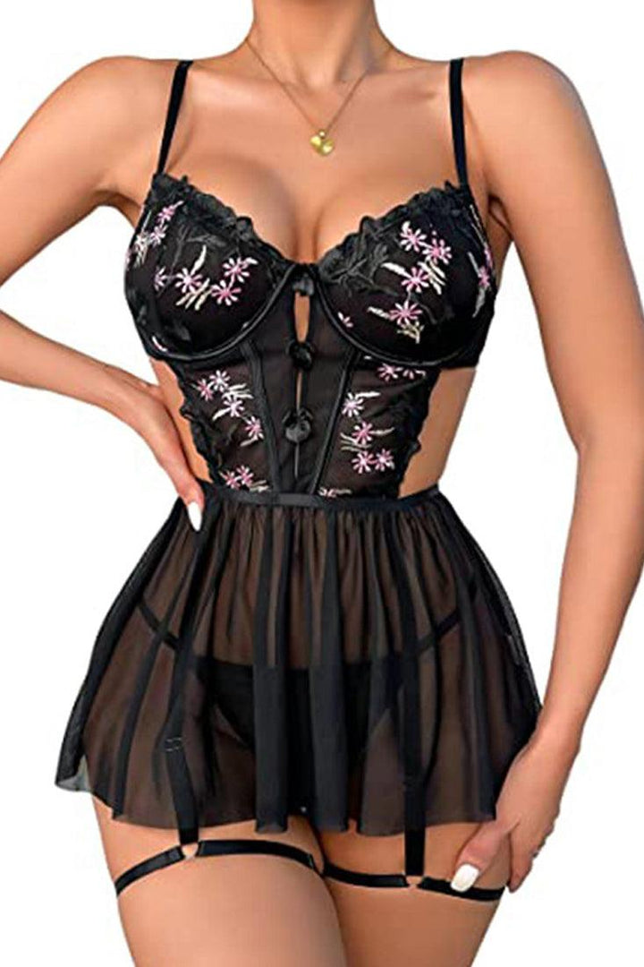 Black Floral Embroider Mesh Skirted Thong Garter 2Pc Lingerie Set