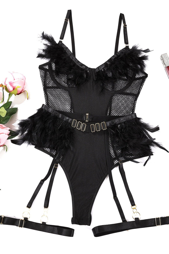 Black Netted Mesh Feather Bodysuit Garter Belt Sexy 4Pc Lingerie Set