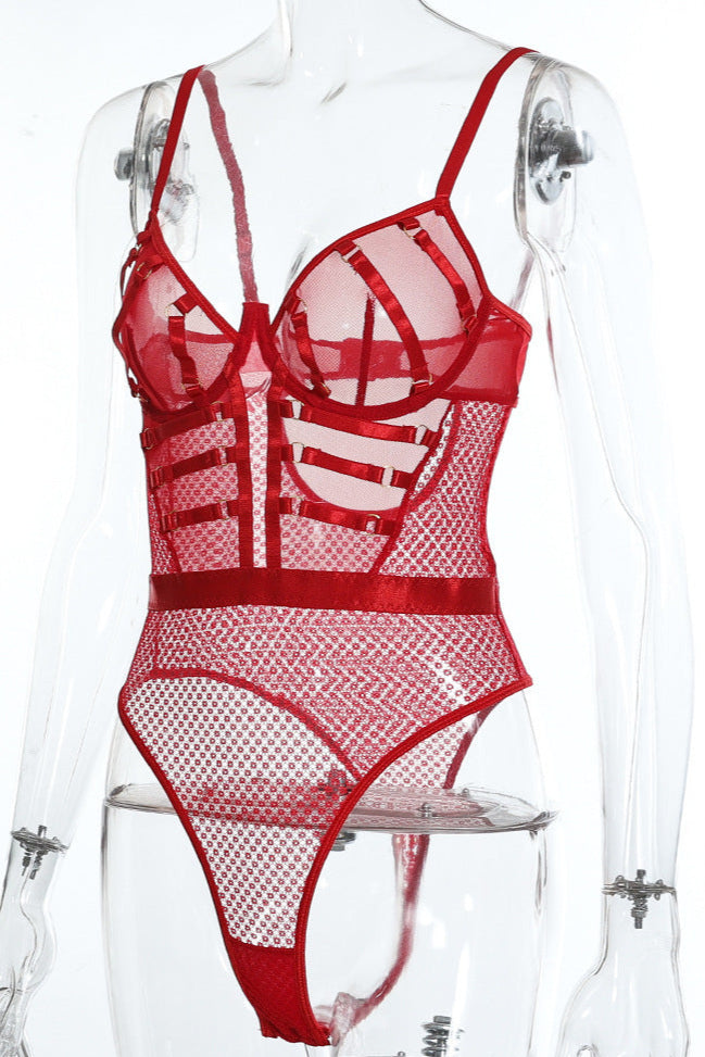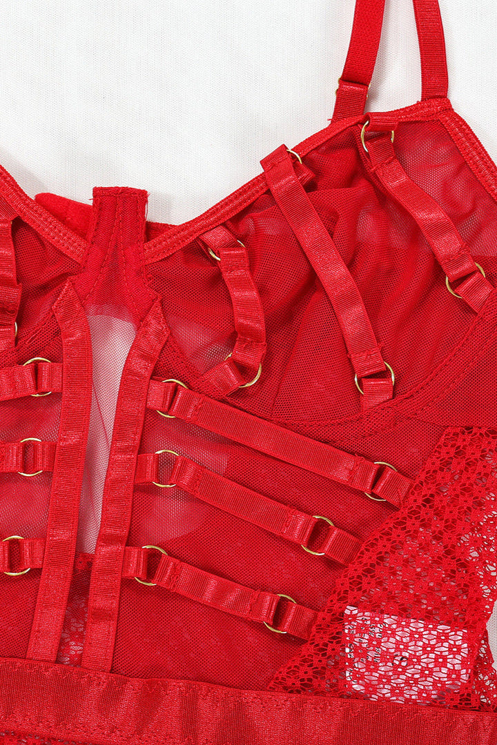 Red Mesh Wired Bandage Buckles Thong Sexy Bodysuit Lingerie