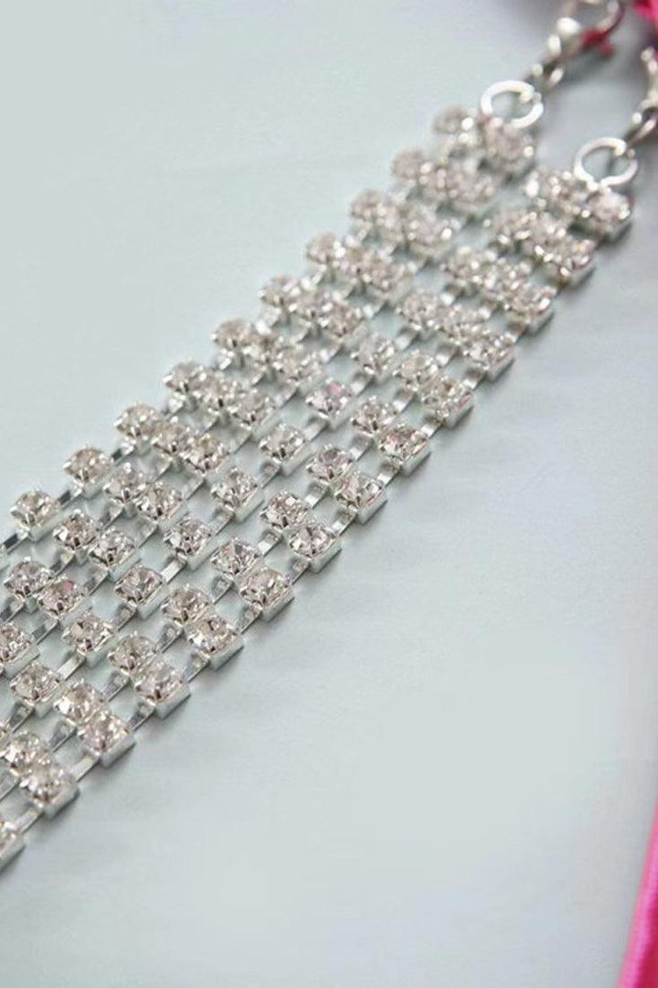 Introducing our Pink Satin Rhinestone Chain Bra Thong Garter Belt 5 Pc Sexy Lingerie Set! With intricate rhinestone detailing and a stylish chain design, this set will add a touch of glam to your lingerie collection. The bra, thong, and garter belt provide a seductive look, making you feel confident and sexy. Upgrade your boudoir wardrobe with this must-have set. (Va-va-voom!)