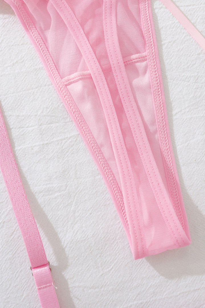 Light Pink Mesh Corset Bra Thong Garter Belt Sexy 4Pc Lingerie Set
