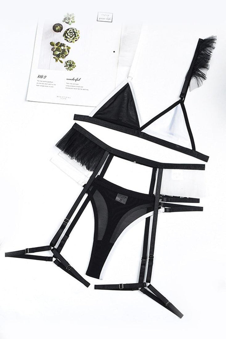 Black White Mesh Ruffle Tulle Strappy Bra Thong Garter Belt Sexy Lingerie Set