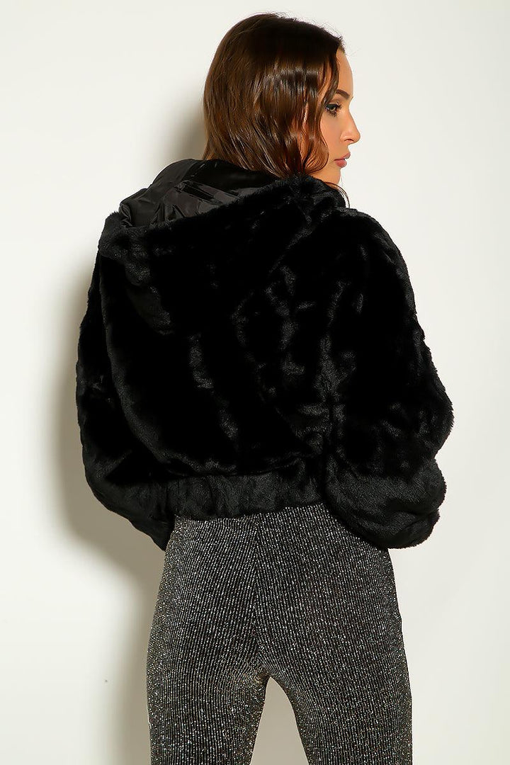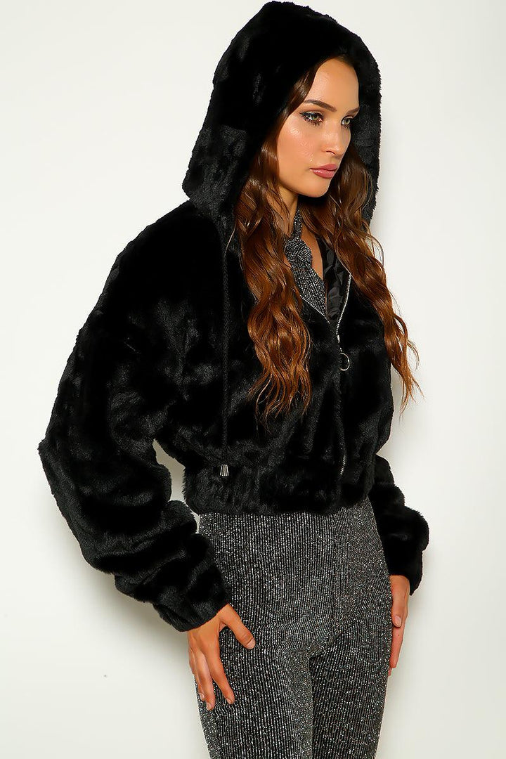 Black Faux Fur Zip Up Fluffy Hoodie Jacket