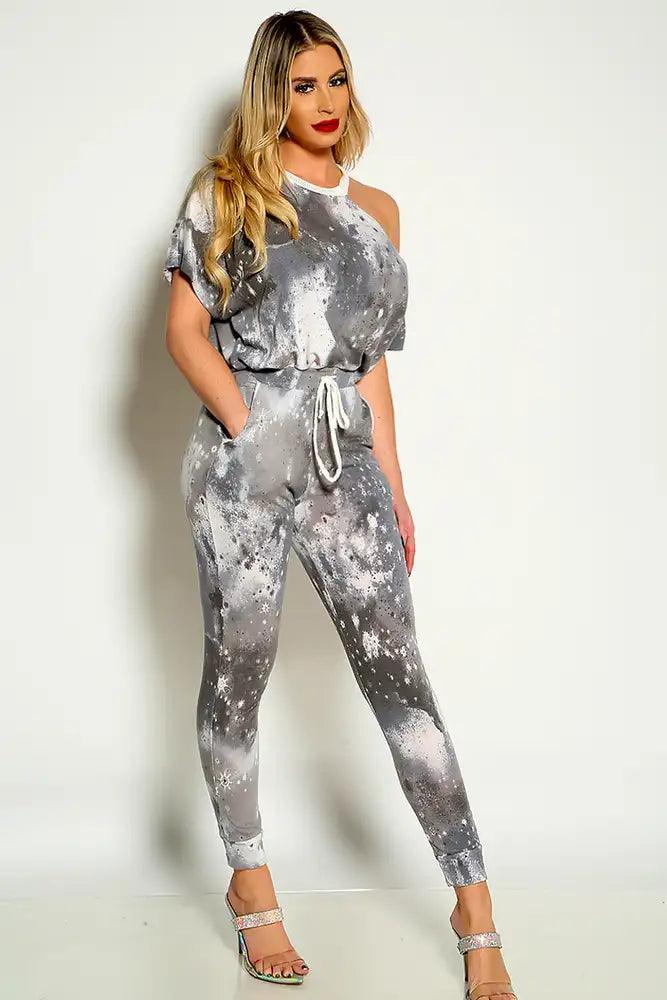 Grey White Short Sleeve Cold Shoulder TWo Piece Loungewear Outfit