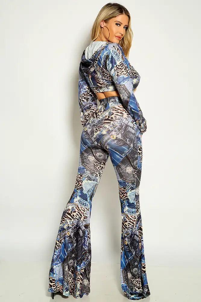Blue Leopard Long Sleeve Cropped Flared Two Piece Outfit