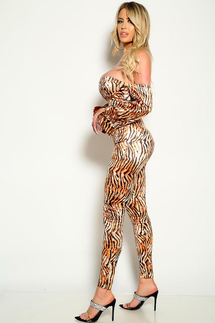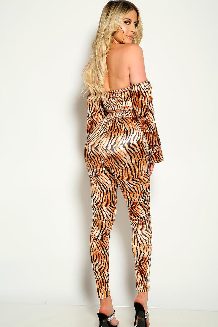 Match your favorite sneaker with this outfit for a trendy look. Featuring; long sleeve, tiger print, two tone, crop top, off the shoulder, matching pants. Followed by a fitted wear.