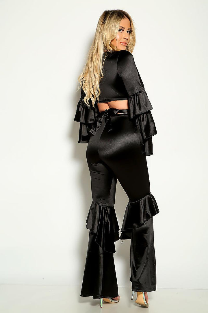 Black Satin Long Sleeves Flared Two Piece Outfit