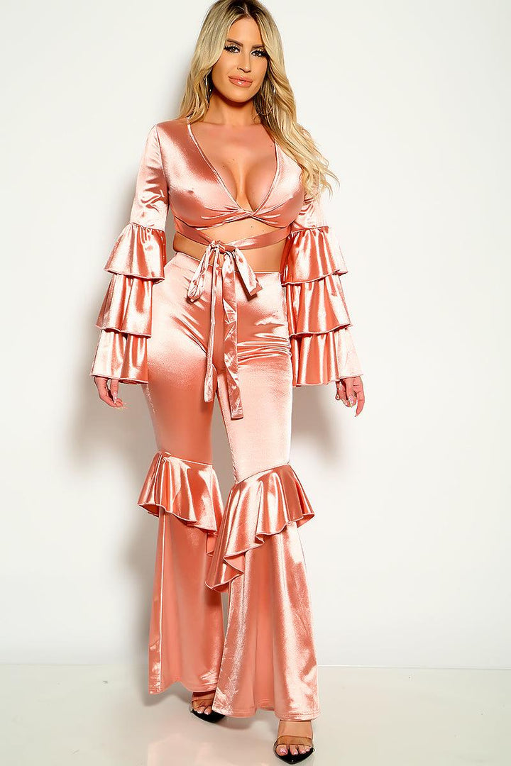 Feel cute in this outfit! Featuring; Long Sleeve, v-cut neckline, cropped top, tie straps, satin, flared leg, matching pants. Followed by a fitted wear. 90% Polyester 10% Spandex.
