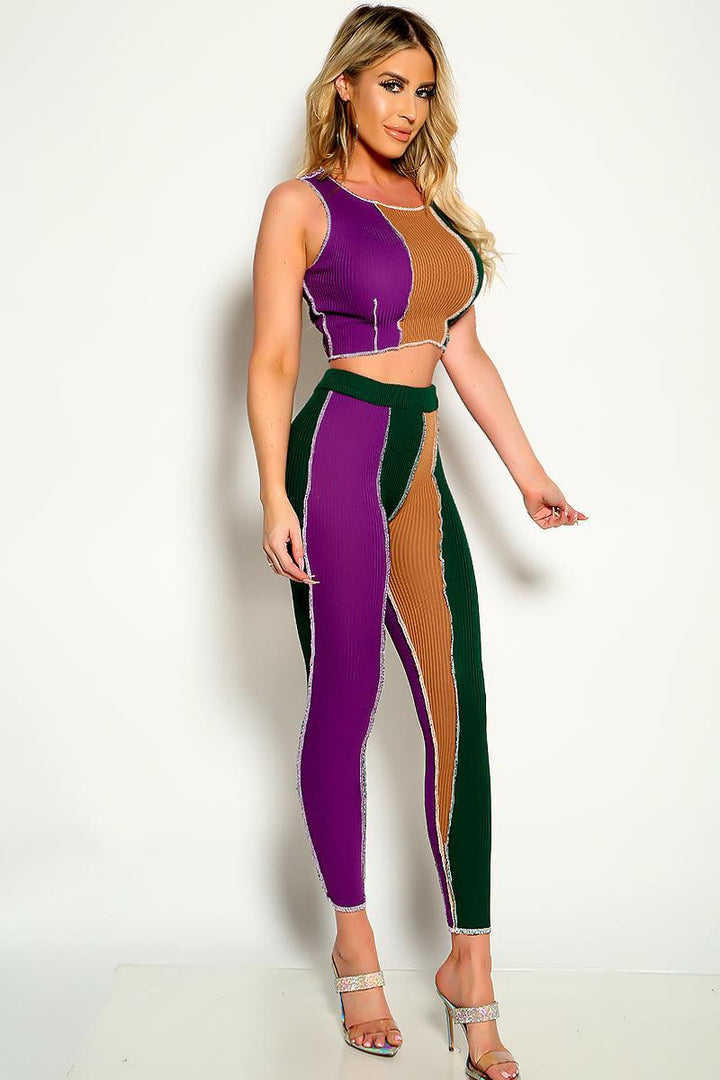 Feel cute in this outfit! Featuring; sleeveless, striped, two tone, scooped neckline, crop top, matching pants. Followed by a fitted wear. 90% Polyester 10% Spandex.