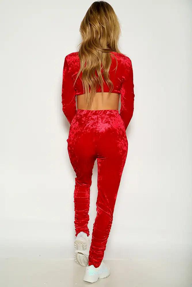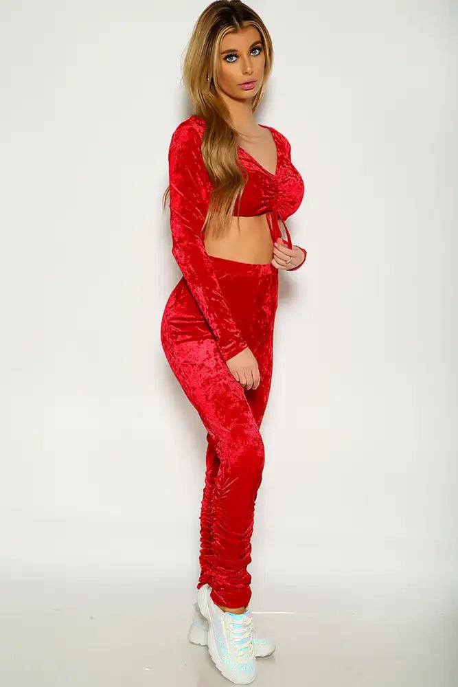 Red Long Sleeve Crushed Velvet Cropped Two Piece Outfit