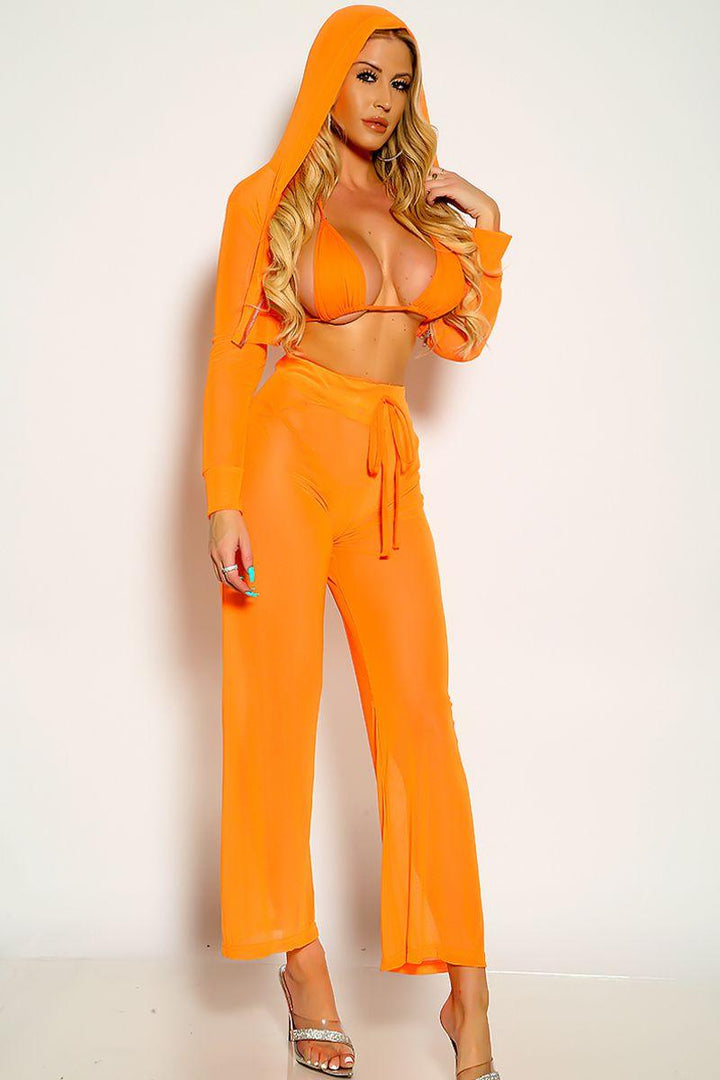 Orange Long sleeve Mesh Hooded Zip Up Flared Two Piece Outfit