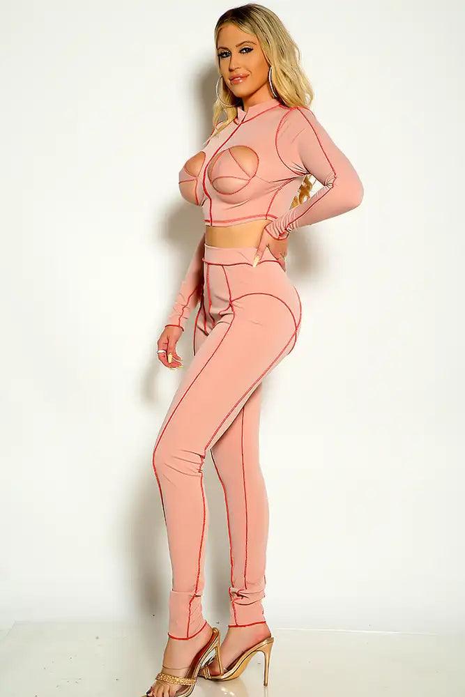 Dusty Pink Long Sleeve Cut Out Stitched Detail Two Piece Outfit