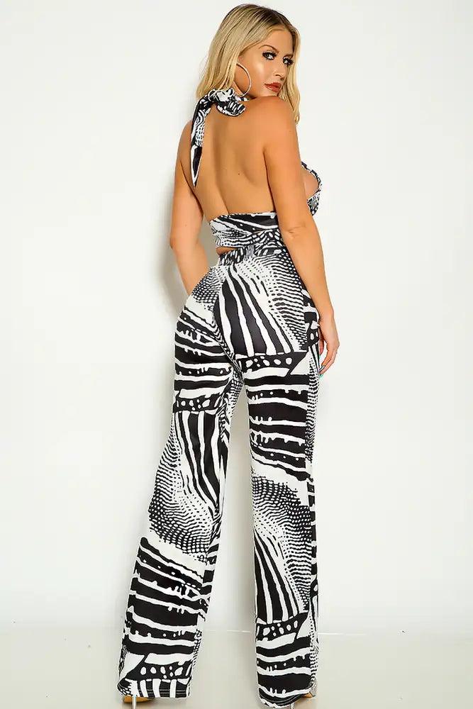 Black White Halter Cross Strap Flared Leg Two Piece Outfit