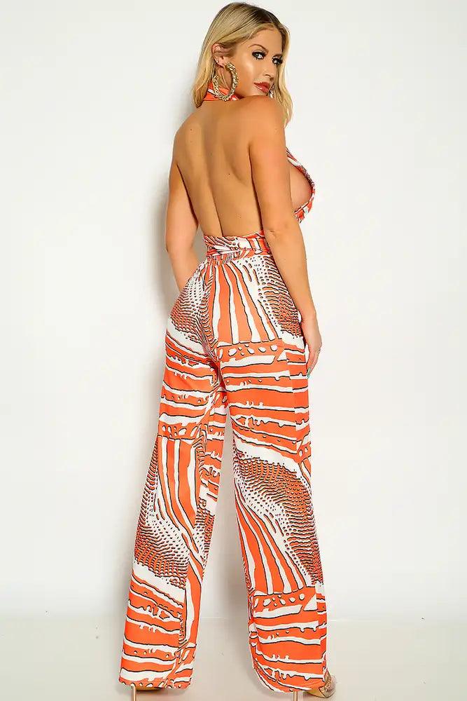 Orange White Halter Cross Strap Flared Leg Two Piece Outfit