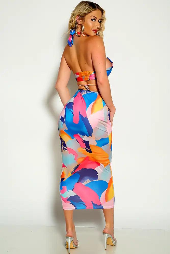 Blue Orange Cross Wrap Strappy Midi Two Piece Dress