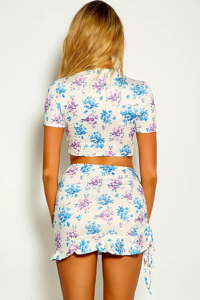 White Blue Floral Print Short Sleeve Front Ruched Tie Two Piece Dress