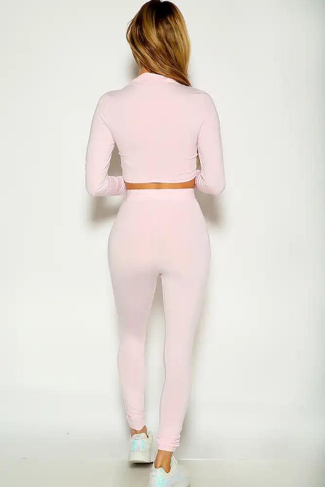 Pink Long Sleeve Mock Neck Cropped Loungewear Two Piece Outfit