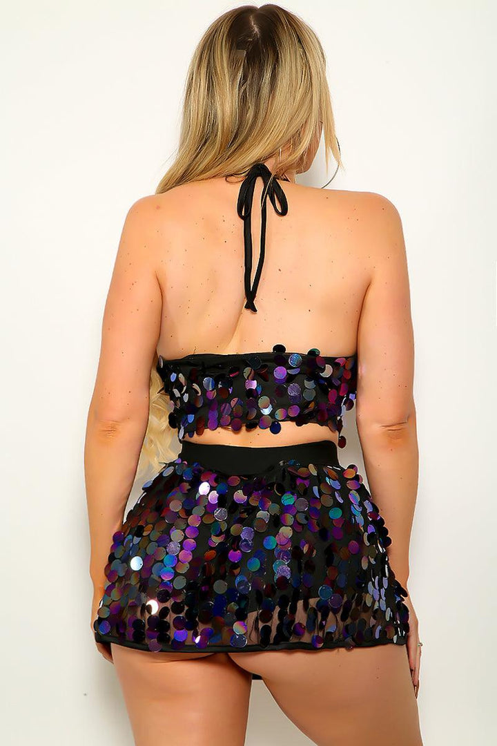 Sparkle into the night wearing this show stopping 2 pc set! Featuring; sleeveless crop top, halter tie back, backless, matching mini skirt, disc sequin design, mesh, followed by a fitted wear. Stretch Fit.