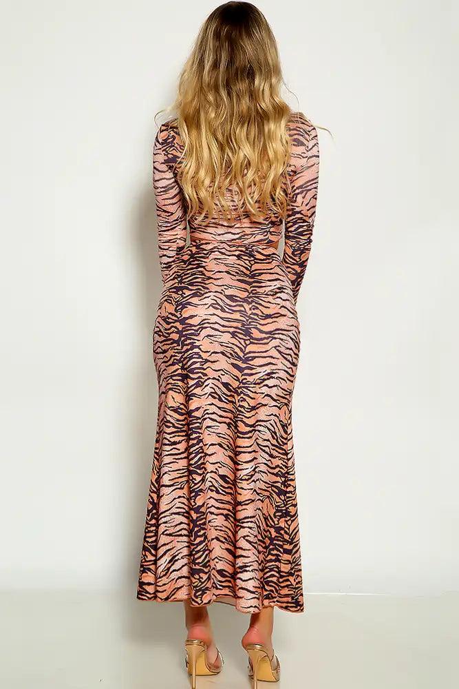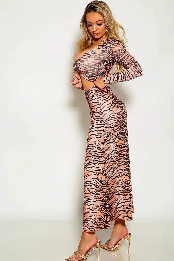 Tiger Print Long Sleeve O-Ring Maxi Two Piece Dress