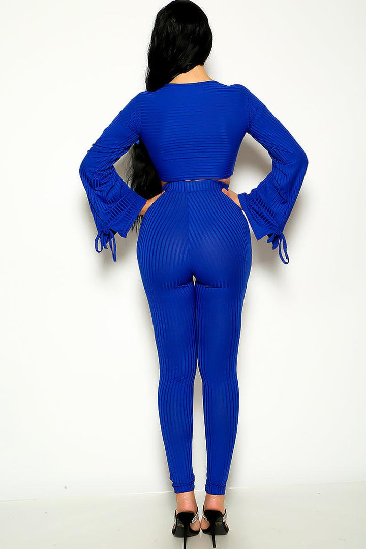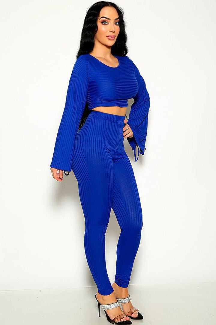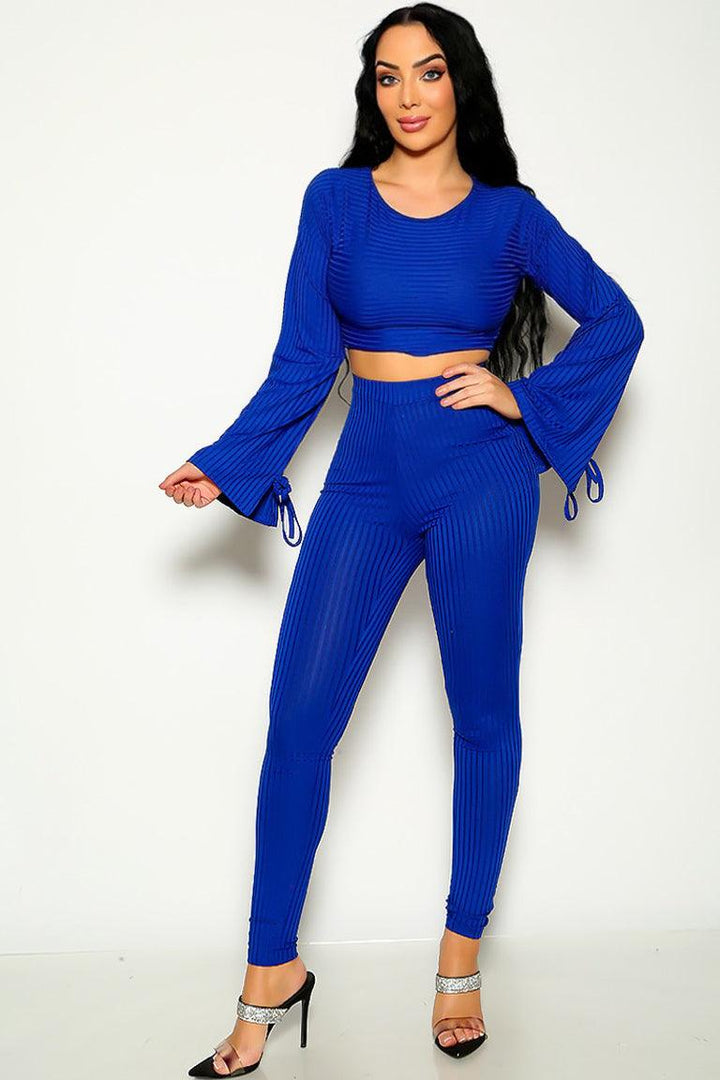 Sexy Blue Ribbed Bell Sleeve Top & Pants Matching 2 Pc Set