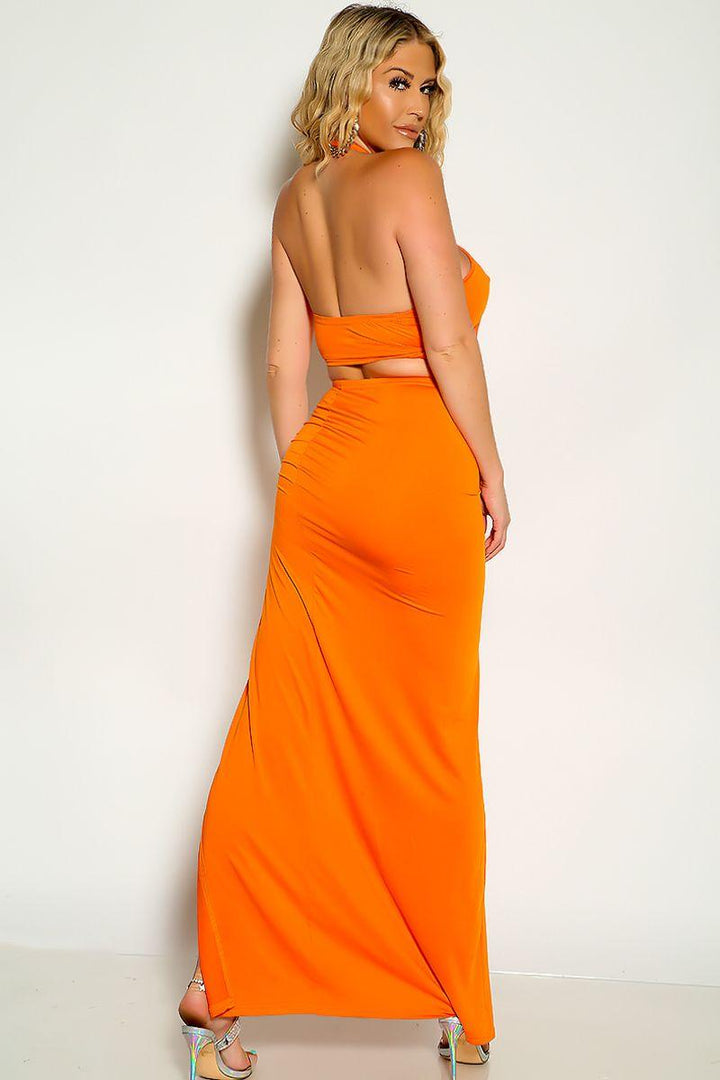 Orange Cross Halter O-Ring Detail Side Slit Ruched Maxi Two Piece Dress