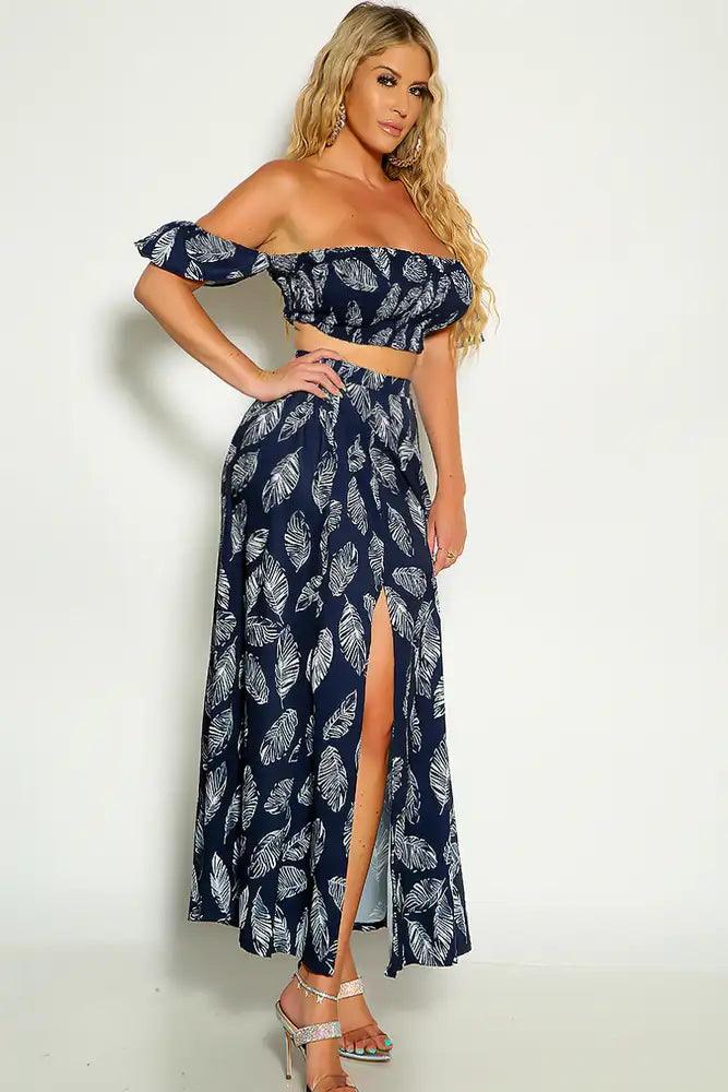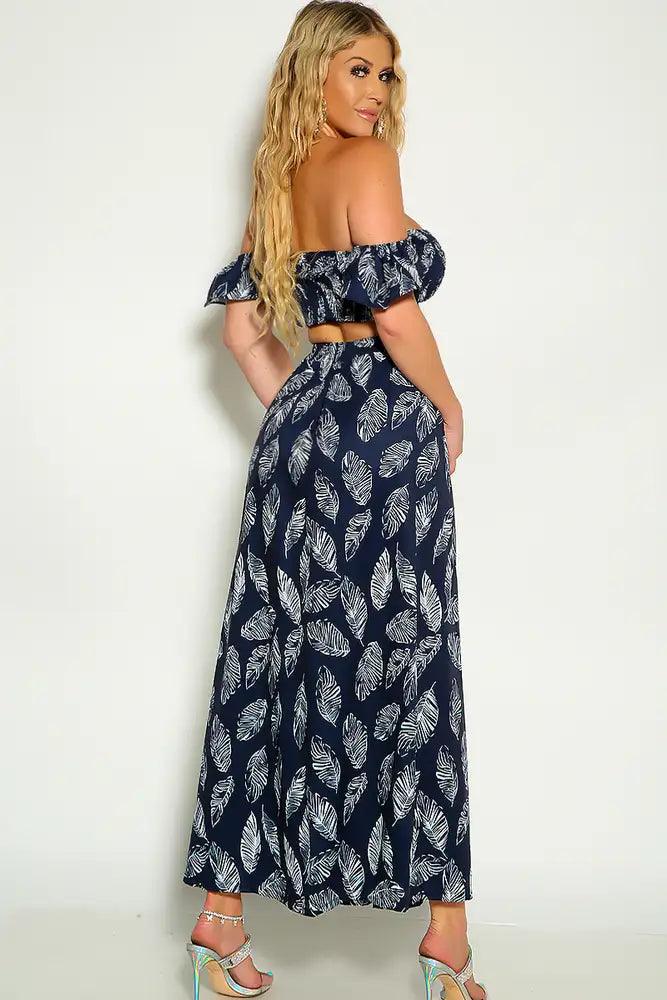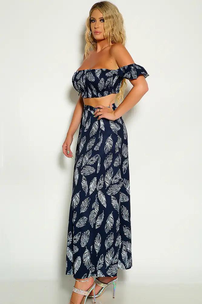 Navy White Off The Shoulder Cropped Maxi Two Piece Dress
