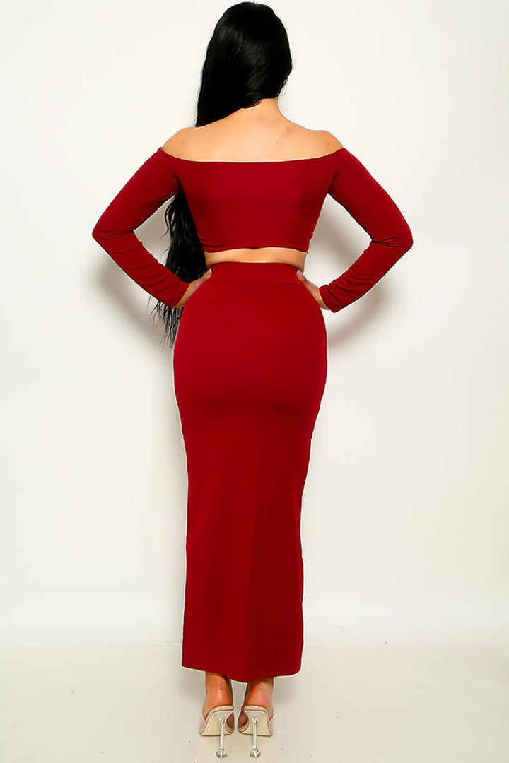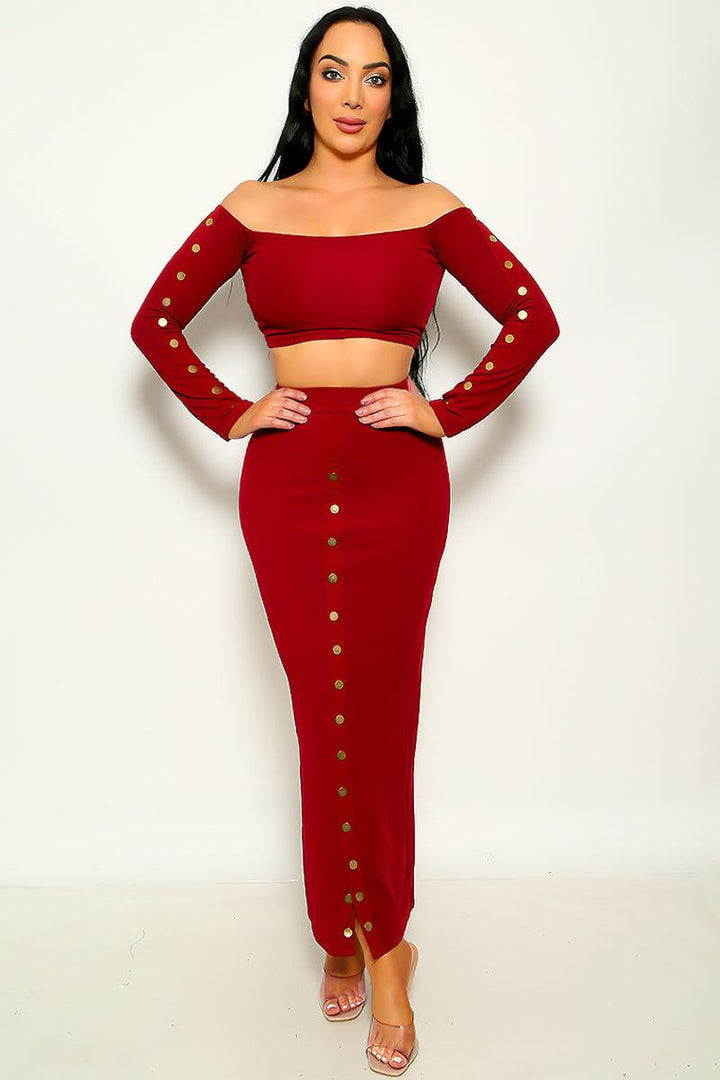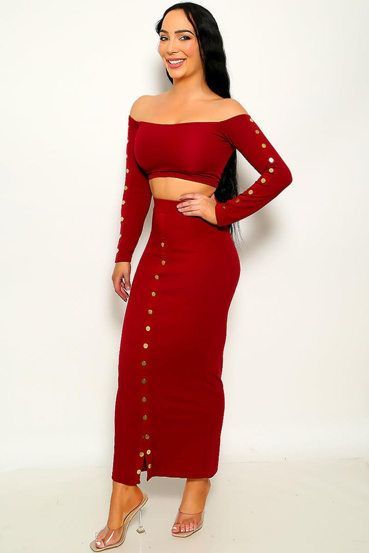 Look and feel fabulous in this sexy set! Featuring; long sleeve crop top, off shoulder, matching maxi skirt, faux button detail, ribbed, followed by a fitted wear. Stretch Fit.