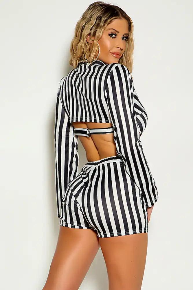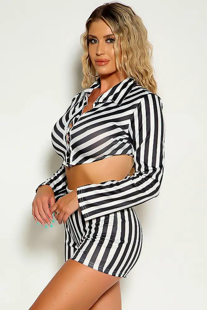 Black Striped Long Sleeve Collared Button Up Two Piece Shorts Outfit