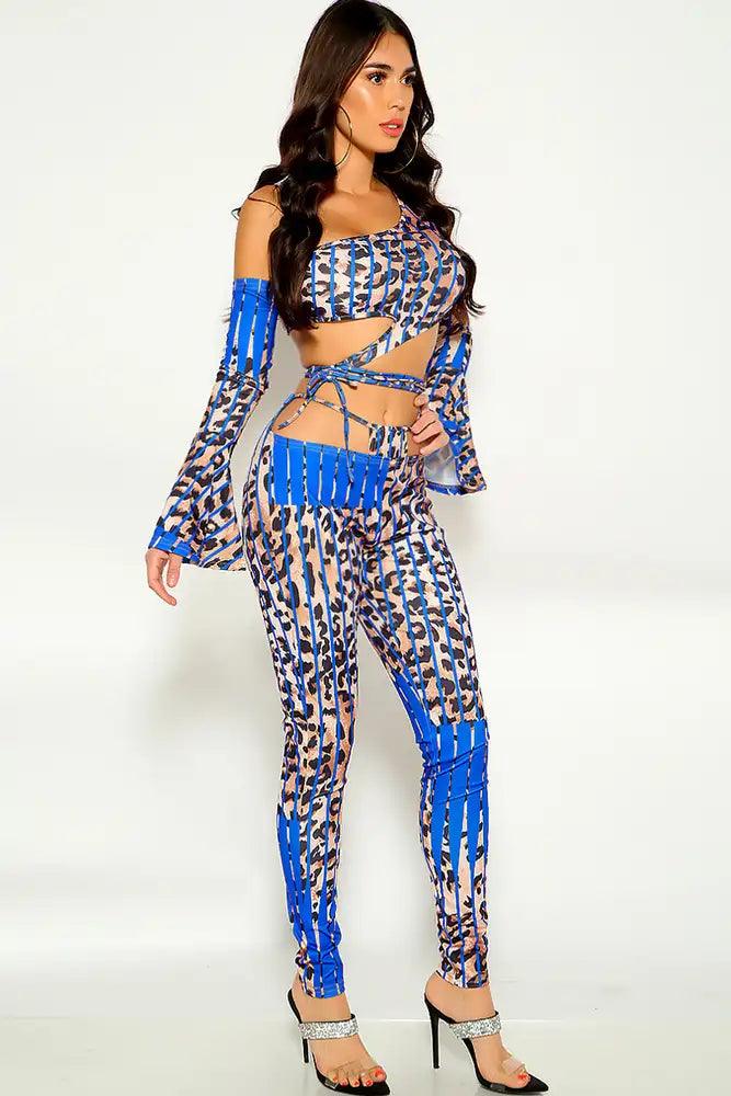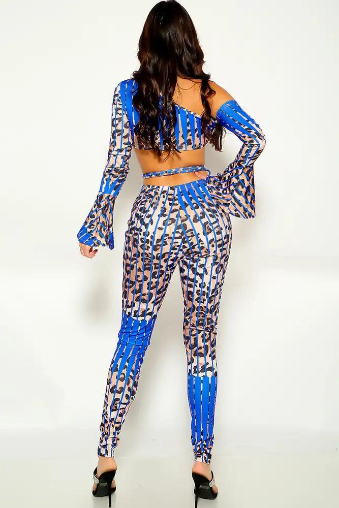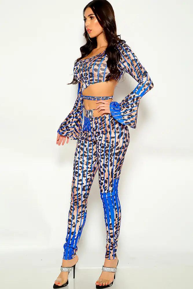 Blue Leopard Bell Sleeve Cut Out Two Piece Outfit
