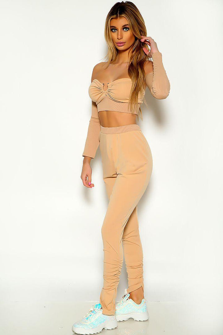Beige Long Sleeve Stitched Detail Cropped Lounge Wear Outfit