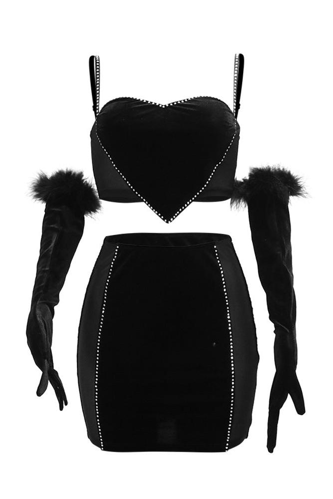 Black Velvet Rhinestone Heart Mesh Fur Trim Gloves 3Pc Party Dress Outfit