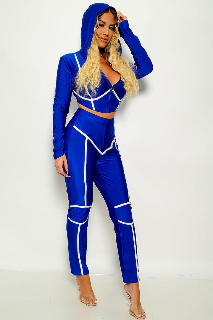 Sexy Royal Blue 2pc Long Sleeve Pants Suit White Trim