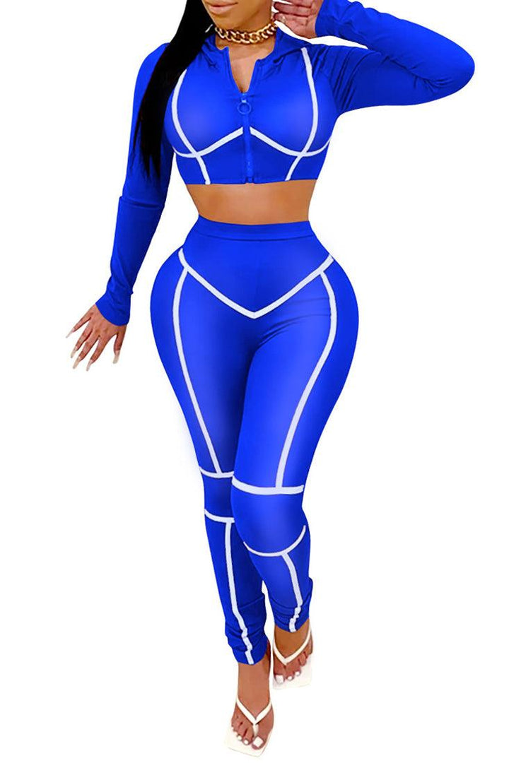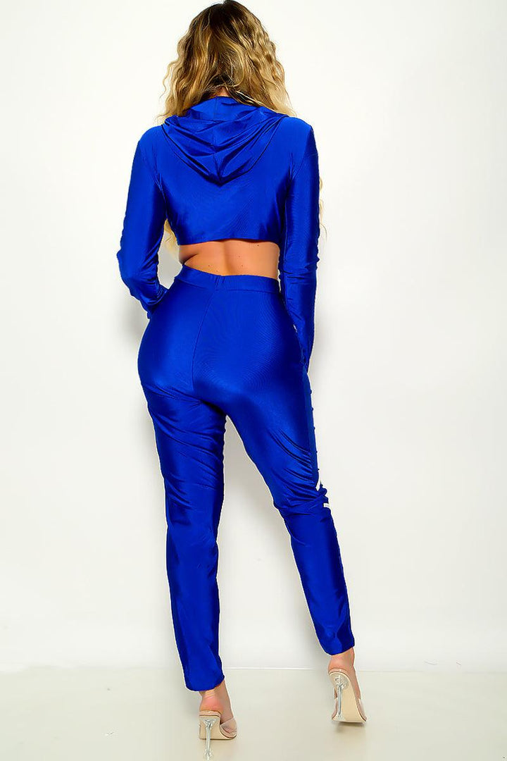 This stylish 2pc pants suit is perfect for any formal event. Crafted from a royal blue fabric with white trim, it is figure-hugging and designed to flatter your curves. With long sleeves, this suit is sure to turn heads and make a statement.