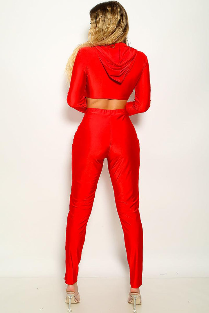 Sexy Red 2pc Long Sleeve Pants Suit White Trim