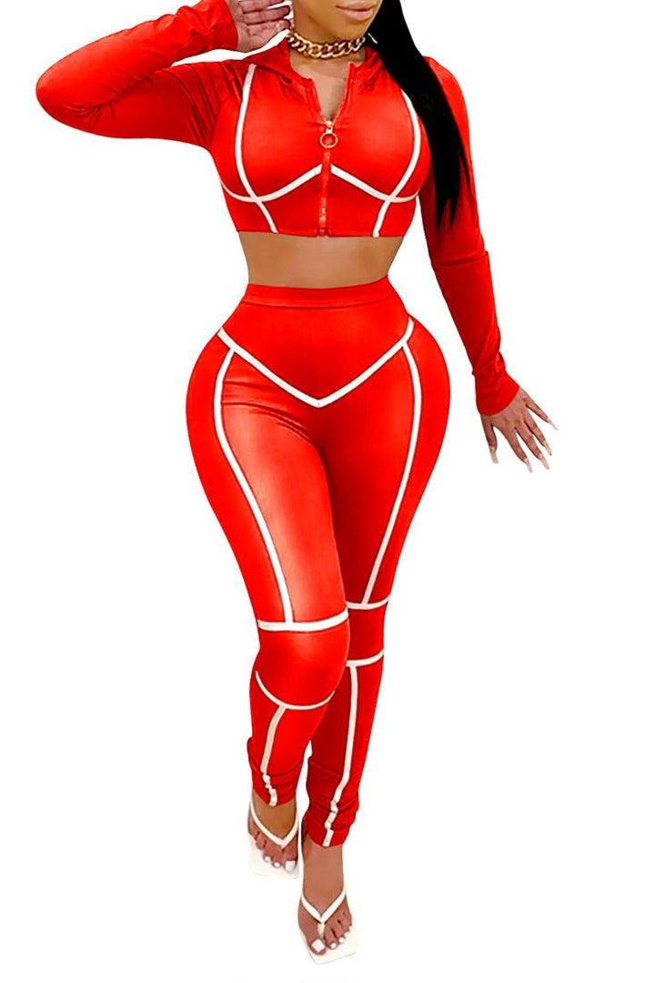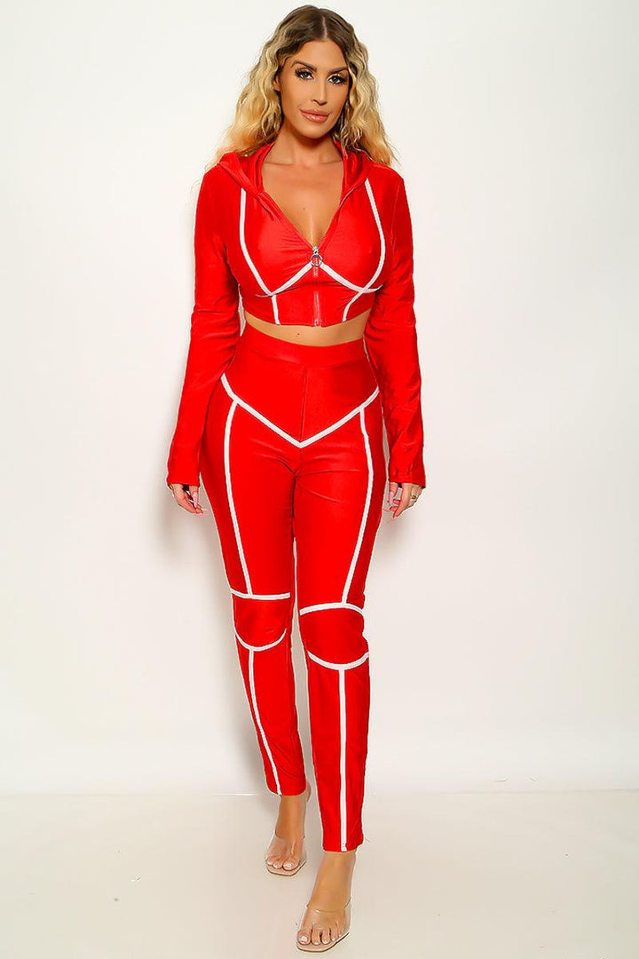 This stylish 2pc pants suit is perfect for any formal event. Crafted from a red fabric with white trim, it is figure-hugging and designed to flatter your curves. With long sleeves, this suit is sure to turn heads and make a statement.