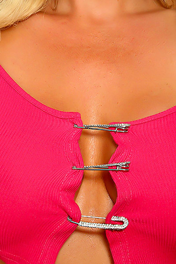 This stylish two piece pants outfit is perfect for any occasion. Made from comfortable and lightweight fabric, the outfit features a sexy pink long sleeve top with unique safety pin cleavage detail. Flattering and fashion forward, this outfit is sure to turn heads.