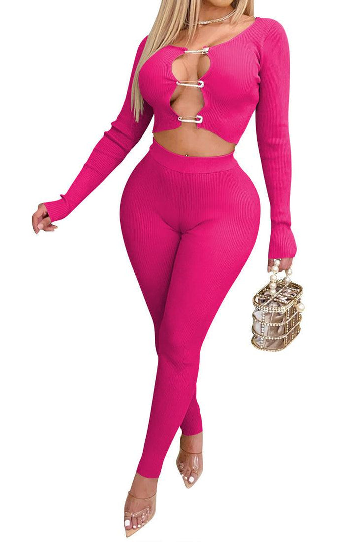 Sexy Pink Long Sleeve Two Piece Pants Outfit With Safety Pin Cleavage Top