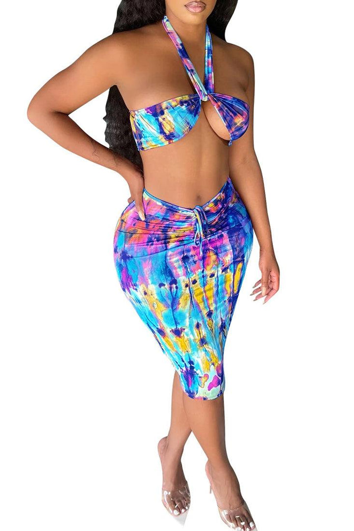 Sexy Blue Multi Two Piece Dress With Halter Top