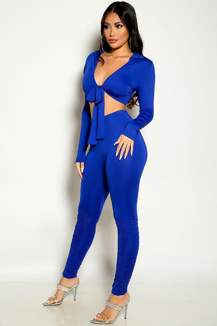 Royal Blue Long Sleeve Cropped Ruched Two Piece Outfit