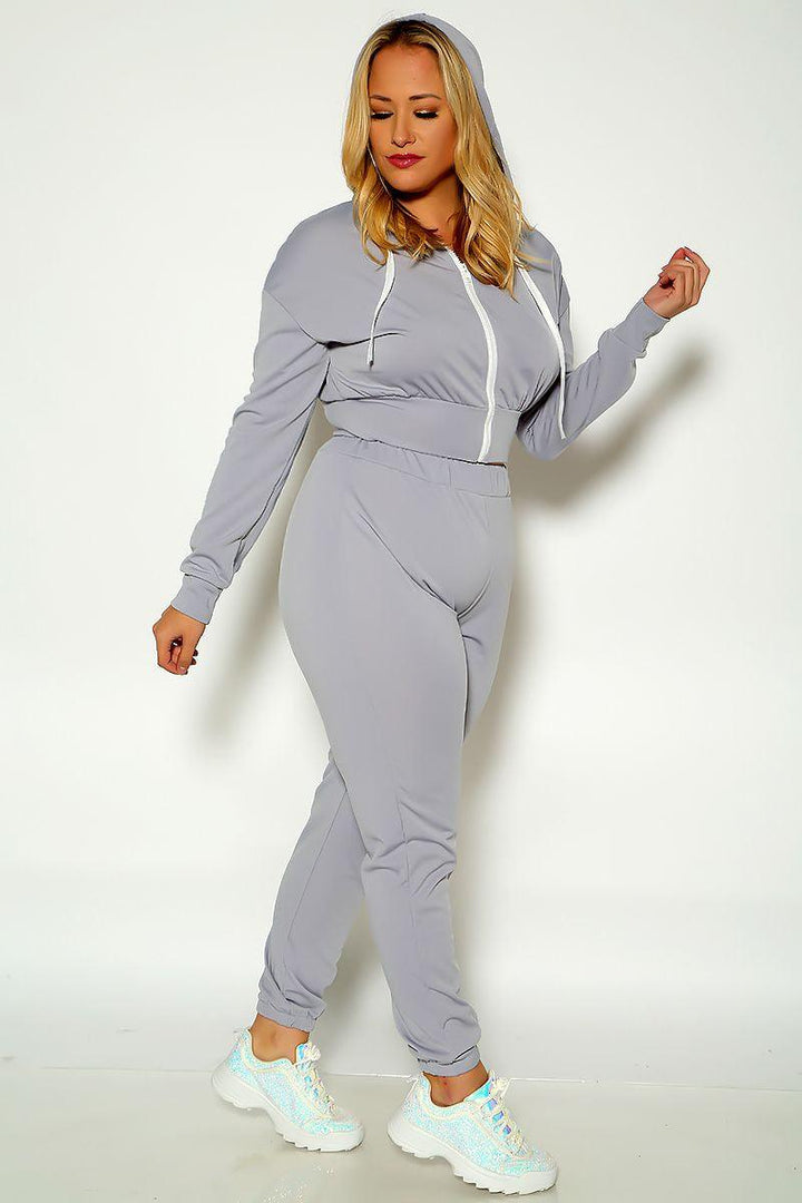 Grey Long Sleeve Hooded Plus Size Two Piece Outfit
