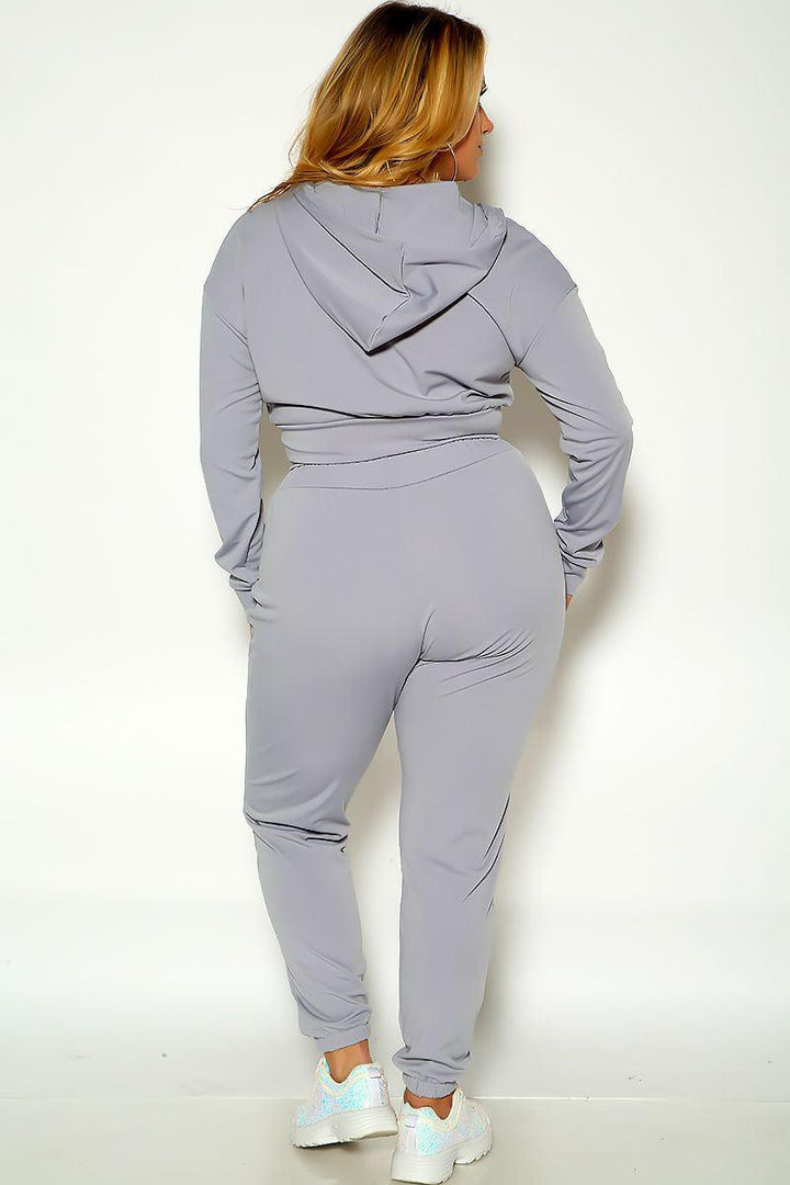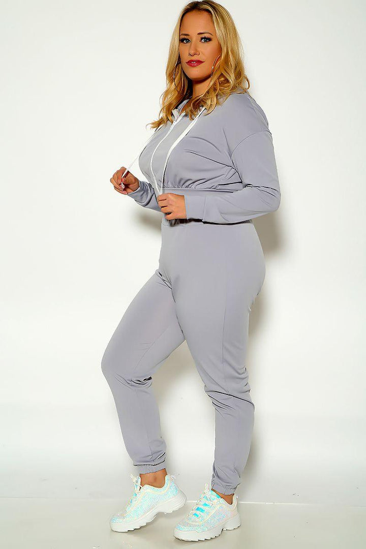 Grey Long Sleeve Hooded Plus Size Two Piece Outfit