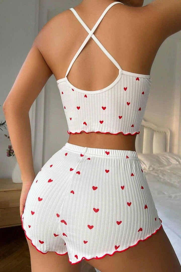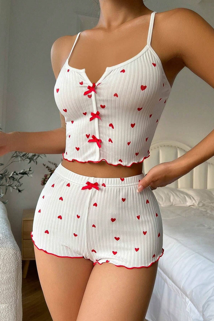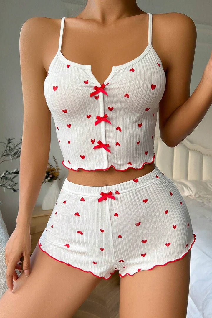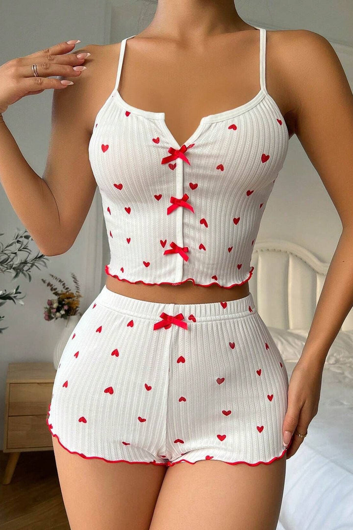 White Red Heart Bow Ruffle Comfy Cami Shorts 2Pc Sexy PJ Set