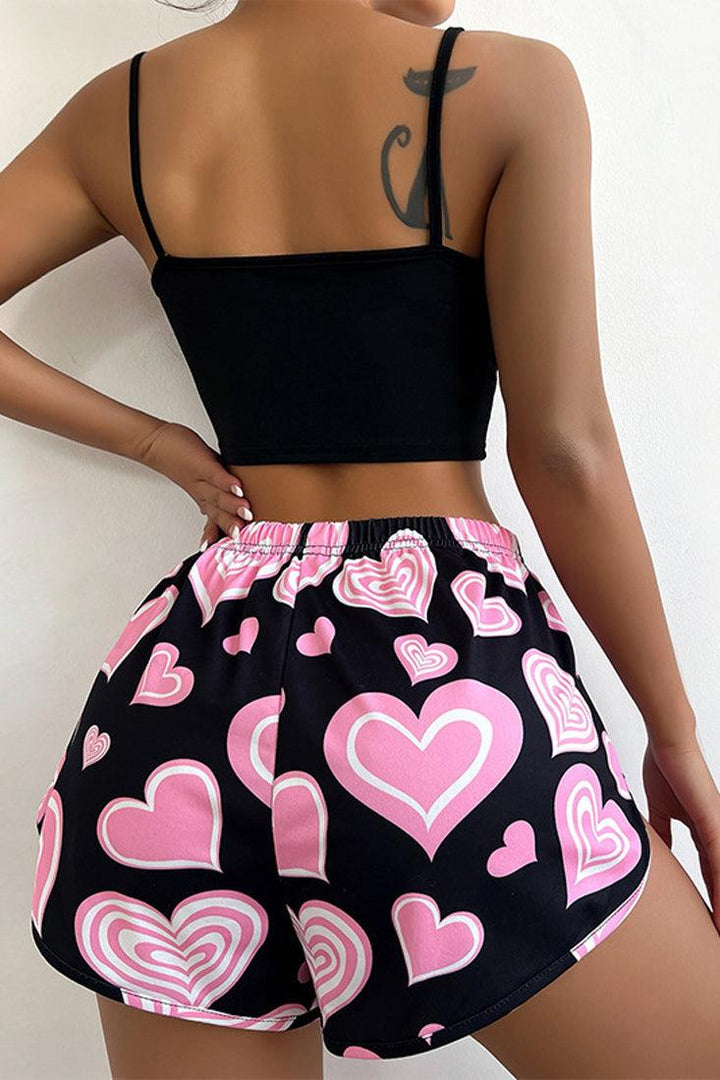 Slip into dreamland with this flirty 2-piece set: Black Pink Hearts Crop Top Booby Shorts! Perfect for lounging or seducing with a playful twist. Cozy up in this sexy pajama set and make all your dreams come true.