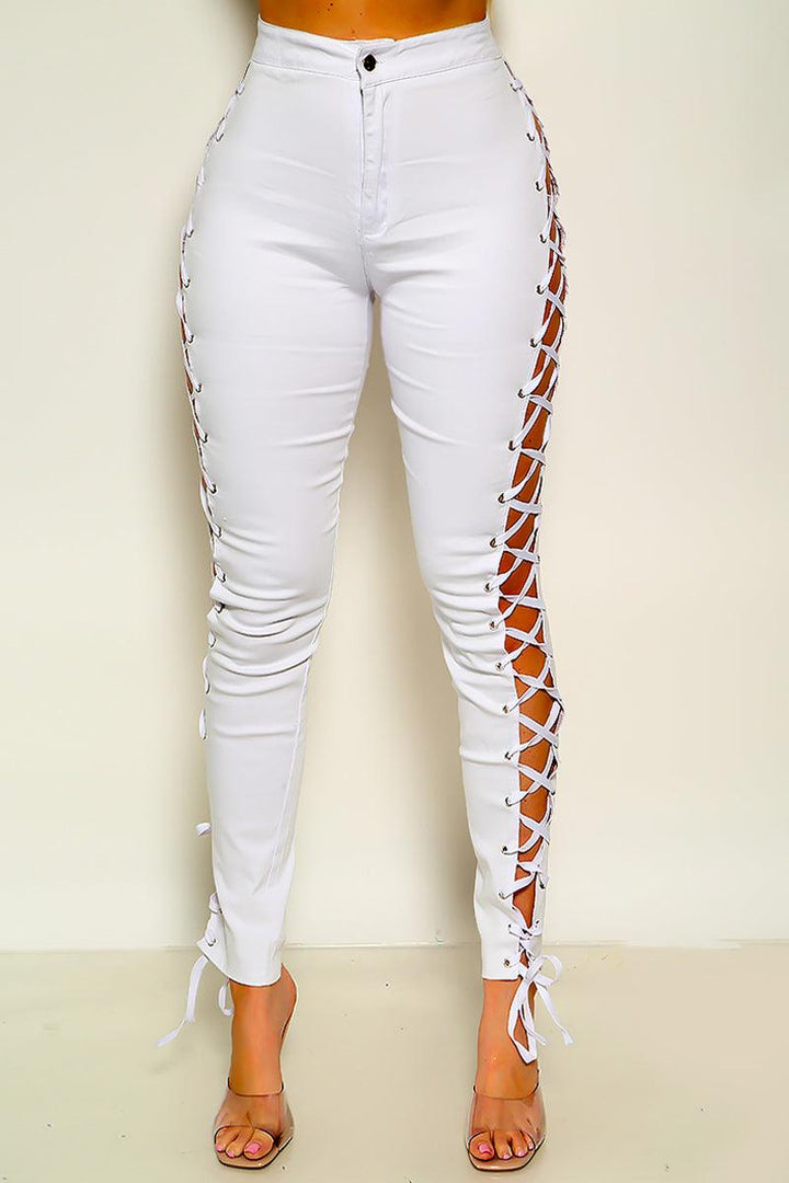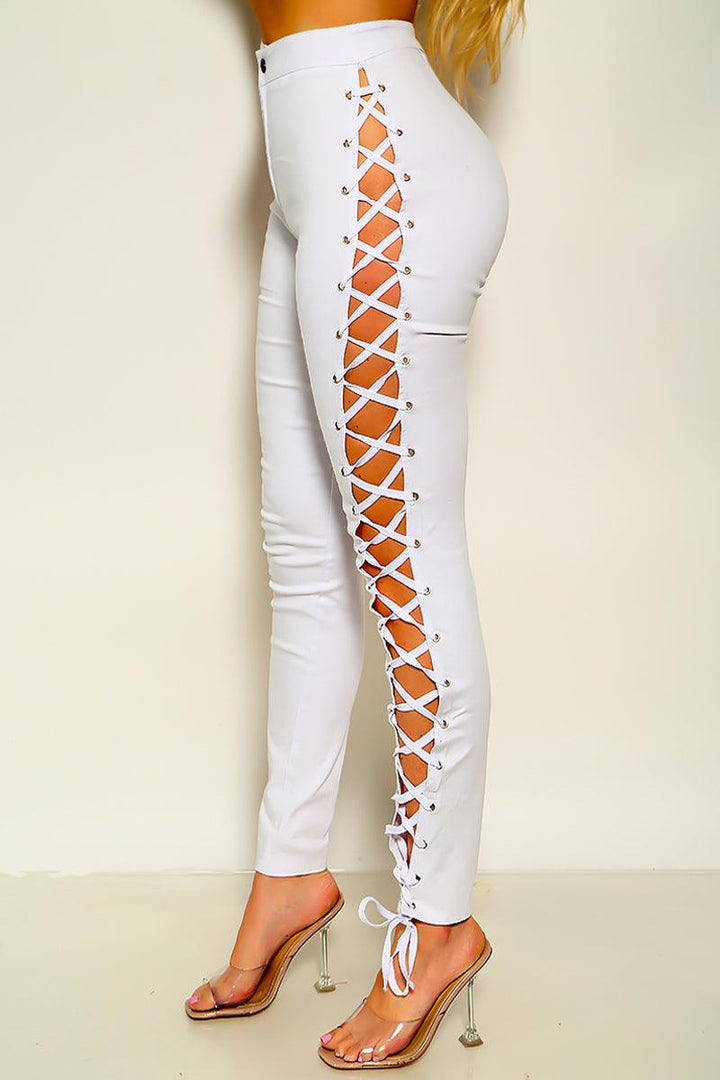 Sexy White Criss-Cross Lace Up Zip Up Pants