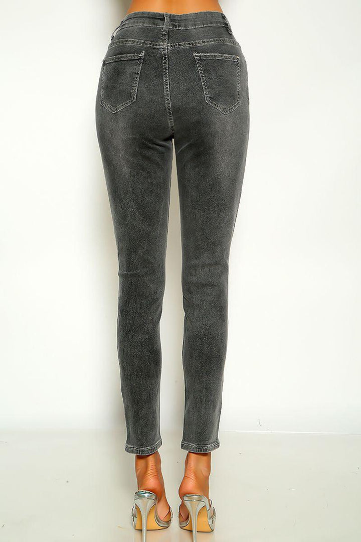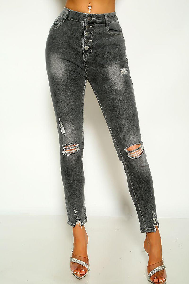 Grey High Waist Button Up Distressed Denim Skinny Jeans