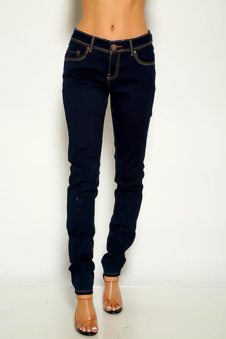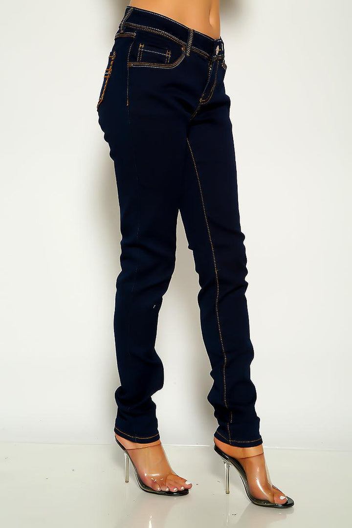Dark Blue Denim Stitch Detail Mid Rise Skinny Jeans